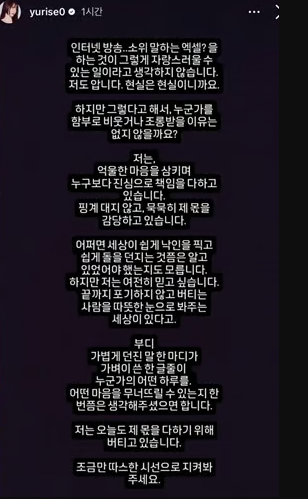 논란이 커지자 서유리는 SNS를 통해 거듭 심경을 밝혔습니다. 그녀는 서유리 엑셀방송 참여가 자랑스러운 일이 아님을 인정하면서도,